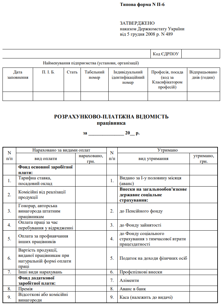 Повна назва бланку: Розрахунково-платіжна відомість працівника (Форма №П-6).