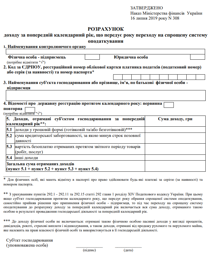 Повна назва бланку: Розрахунок доходу за попередній календарний рік, що передує року переходу на спрощену систему оподаткування