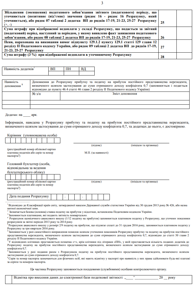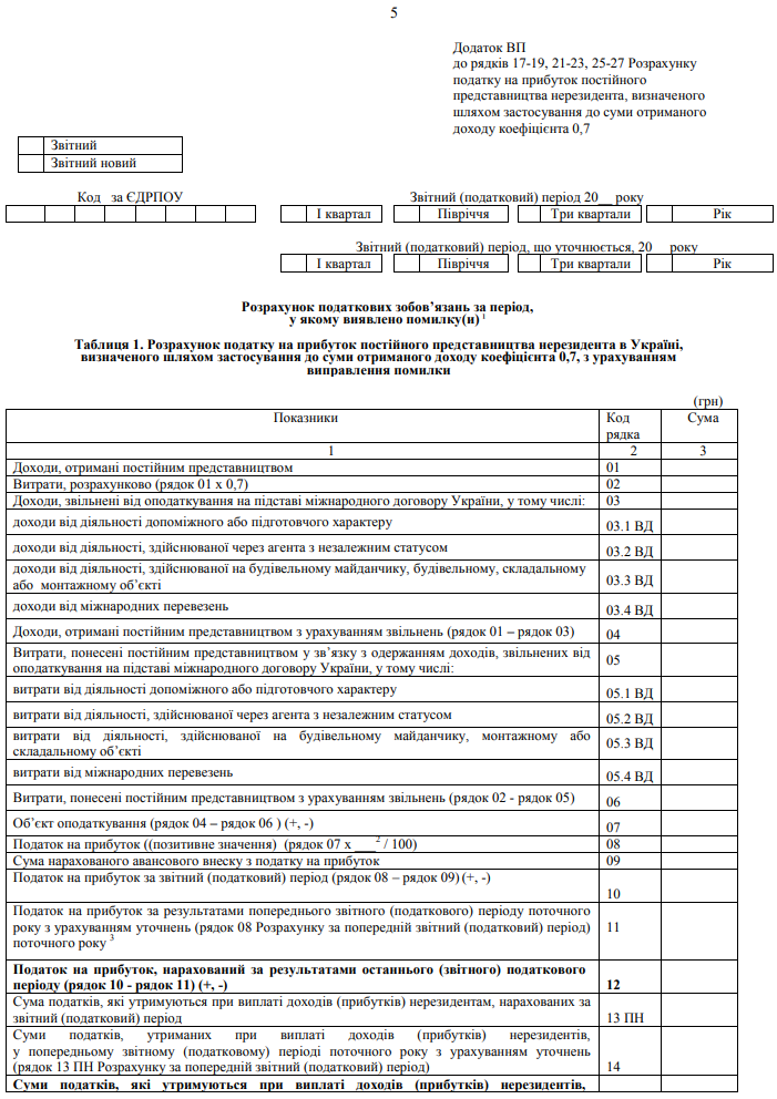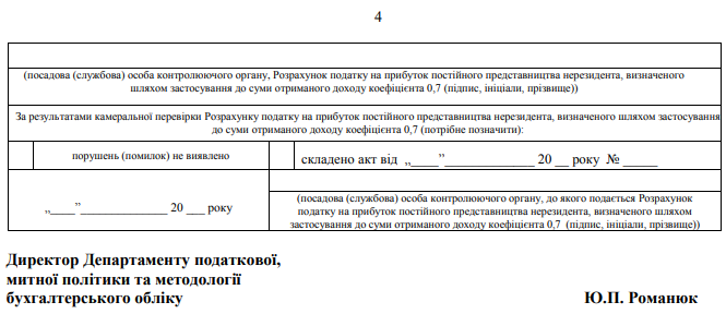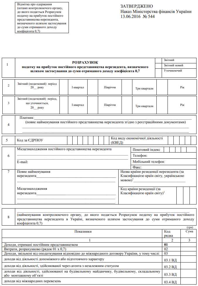 Повна назва бланку: Розрахунок податку на прибуток постійного представництва нерезидента, визначеного шляхом застосування до суми отриманого доходу коефіцієнта 0,7
