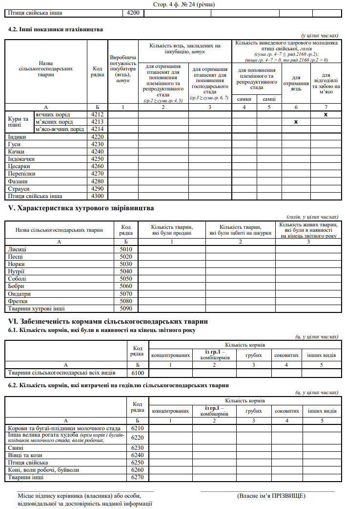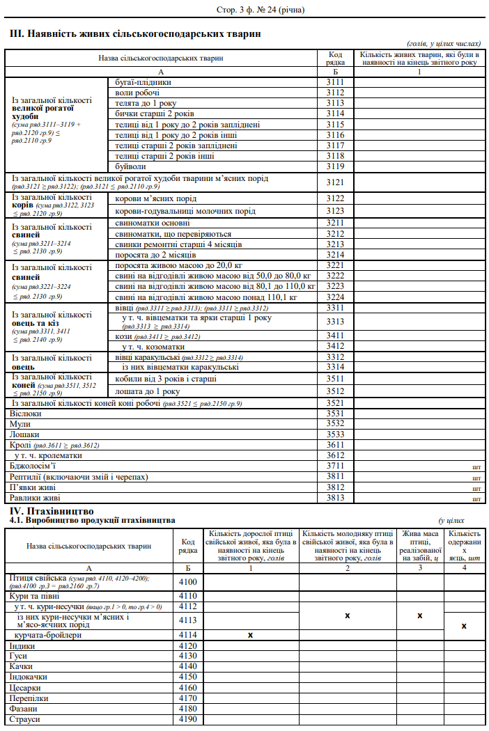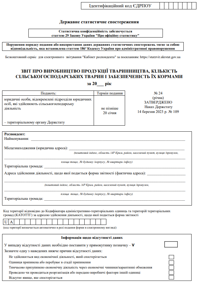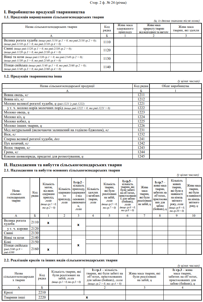 Повна назва бланку: Звіт про виробництво продукції тваринництва, кількість сільськогосподарських тварин і забезпеченість їх кормами (форма №24, річна)