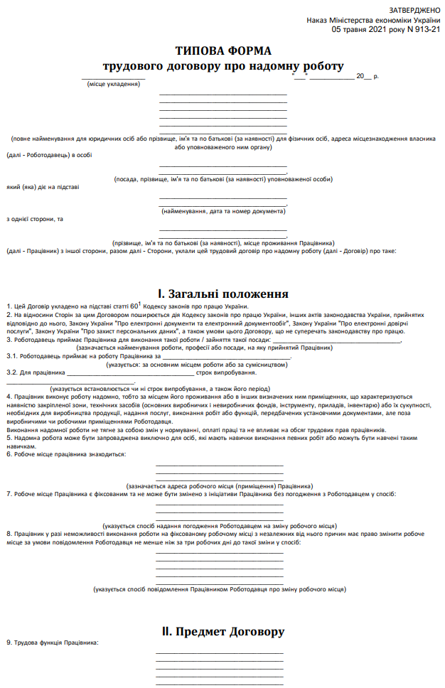 Затверджено бланк "Типова форма трудового договору про надомну роботу"