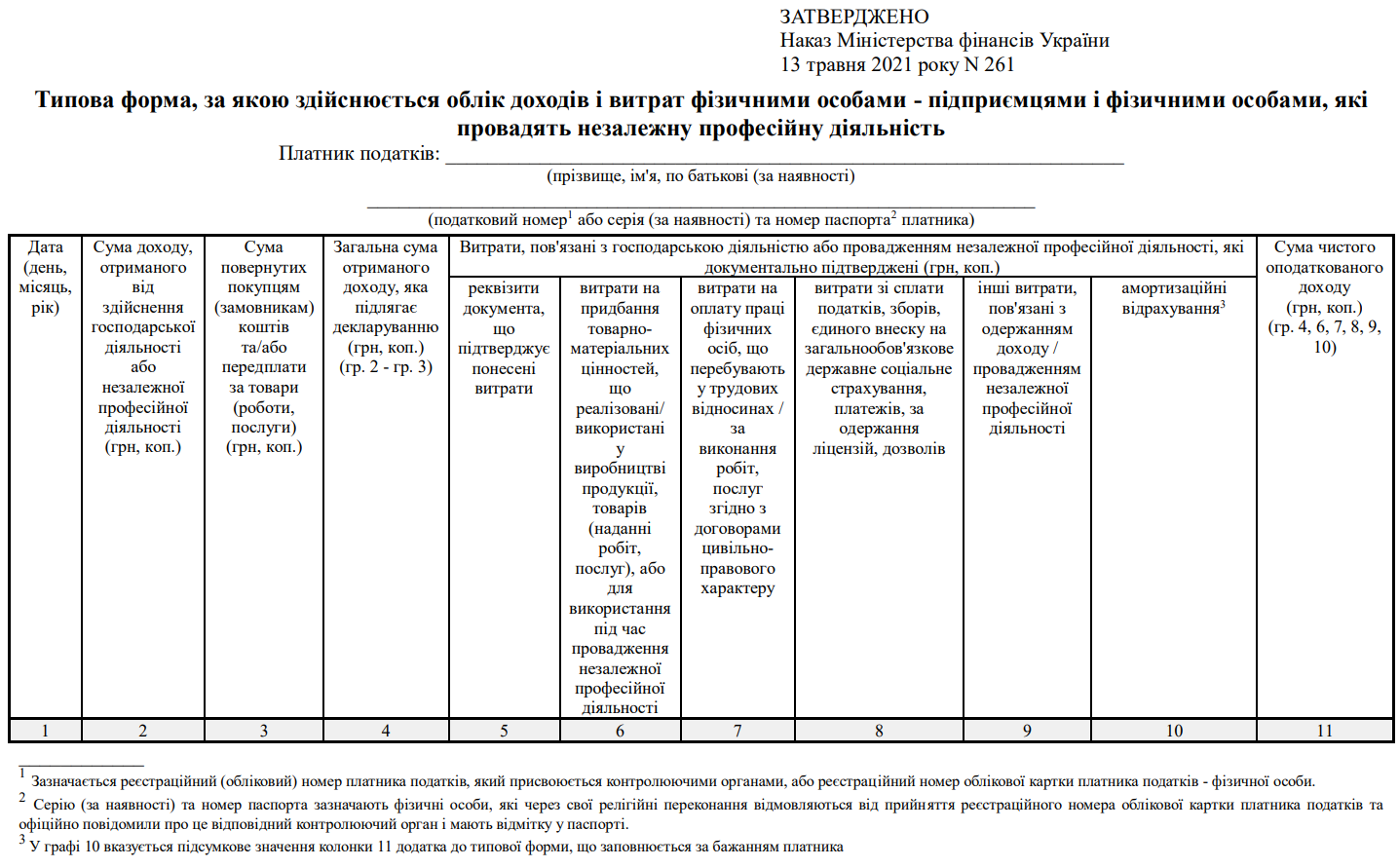 Повна назва бланку: Типова форма, за якою здійснюється облік доходів і витрат фізичними особами - підприємцями і фізичними особами, які провадять незалежну професійну діяльність.