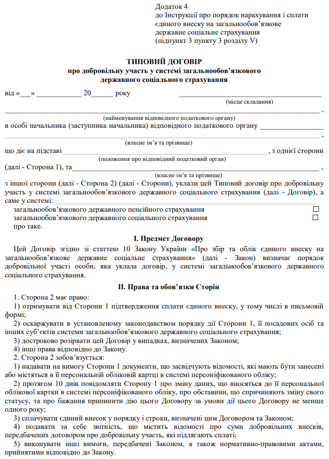 Завантажити бланк: "Типовий договір про добровільну участь у системі загальнообов'язкового державного соціального страхування"