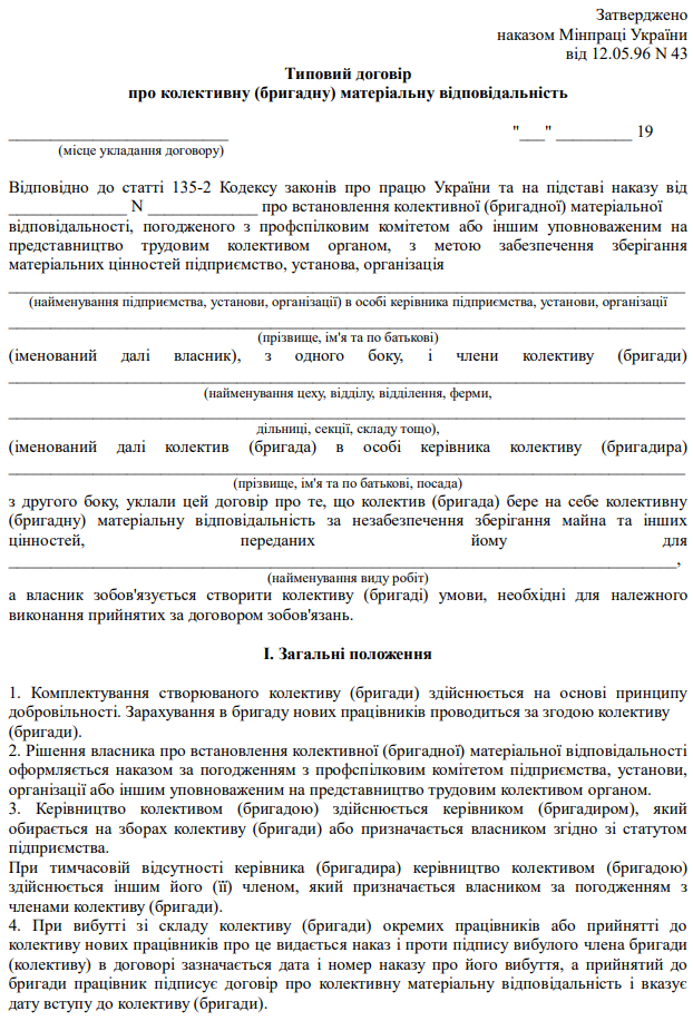 Завантажити бланк: "Типовий договір про колективну (бригадну) матеріальну відповідальність"