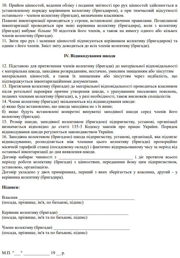 Повна назва бланку: Типовий договір про колективну (бригадну) матеріальну відповідальність.