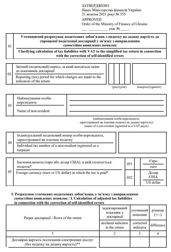 Повна назва бланку: Уточнюючий розрахунок податкових зобов'язань з податку на додану вартість до спрощеної податкової декларації у зв'язку з виправленням самостійно виявлених помилок.