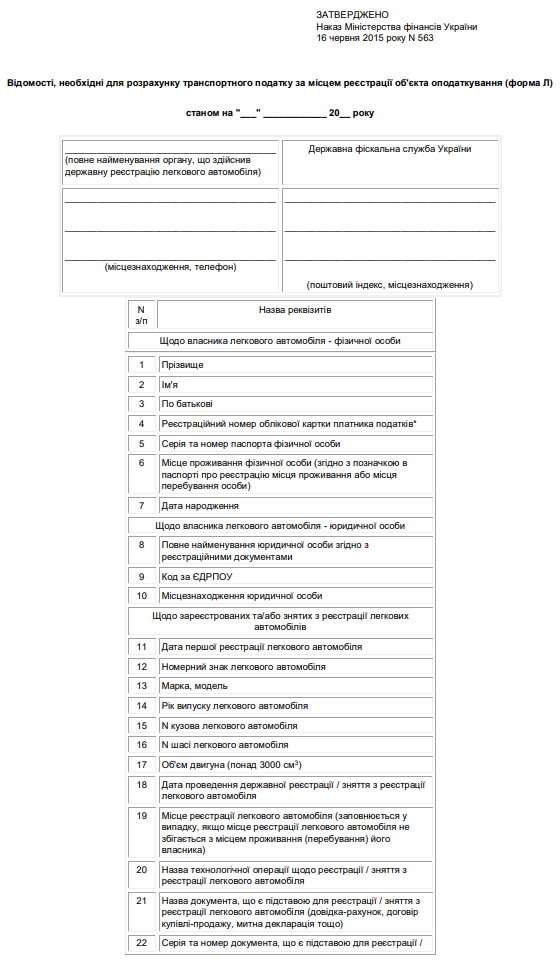 Повна назва бланку: Відомості, необхідні для розрахунку транспортного податку за місцем реєстрації об'єкта оподаткування (форма Л)