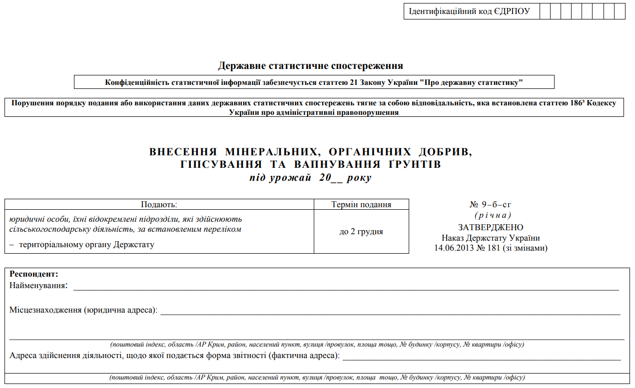 Повна назва бланку: Внесення мінеральних, органічних добрив, гіпсування та вапнування ґрунтів під урожай 20__ року (форма №9-б-сг)