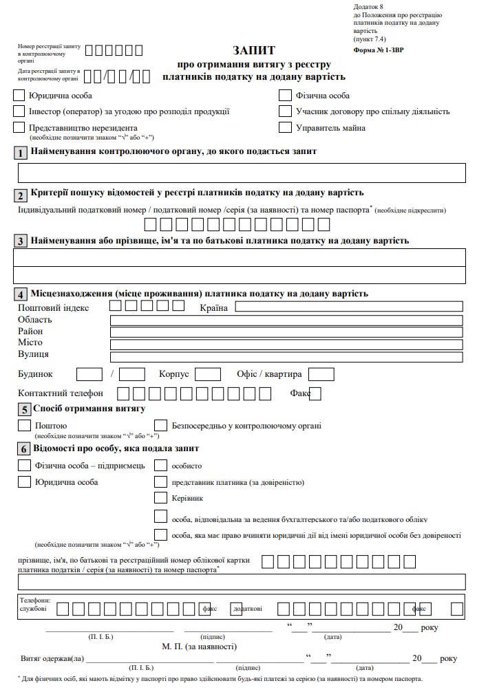 Повна назва бланку: Запит про отримання довідки з реєстру платників податку на додану вартість (форма №1-ЗДР)