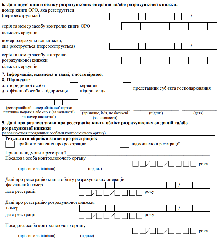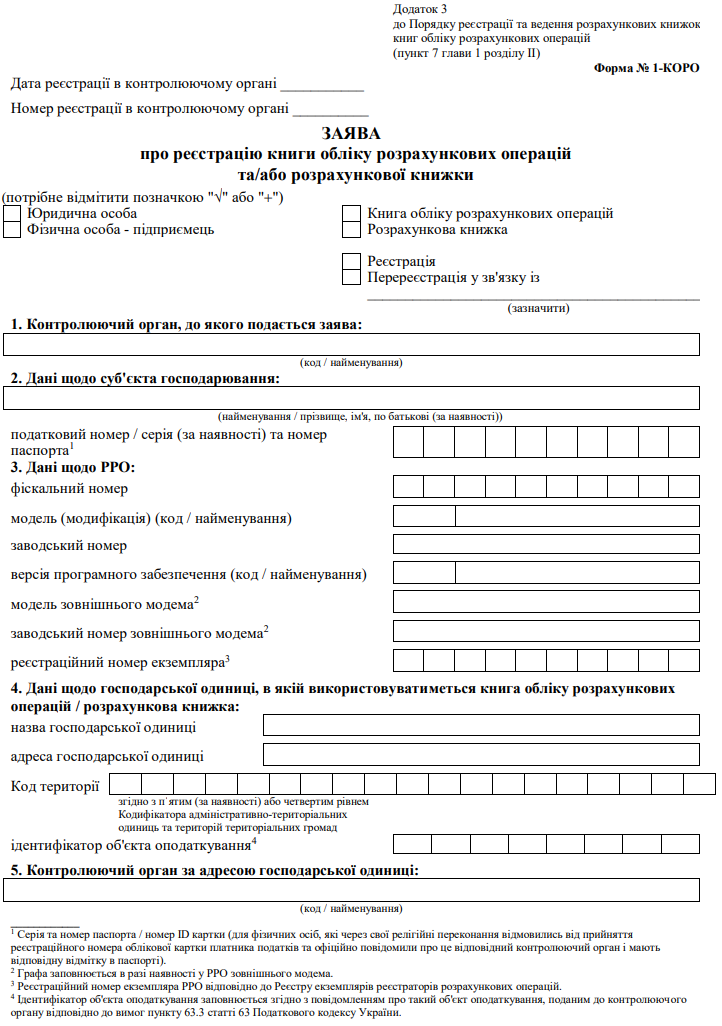 Повна назва бланку: Заява про реєстрацію книги обліку розрахункових операцій та/або розрахункової книжки (ф. №1-КОРО)