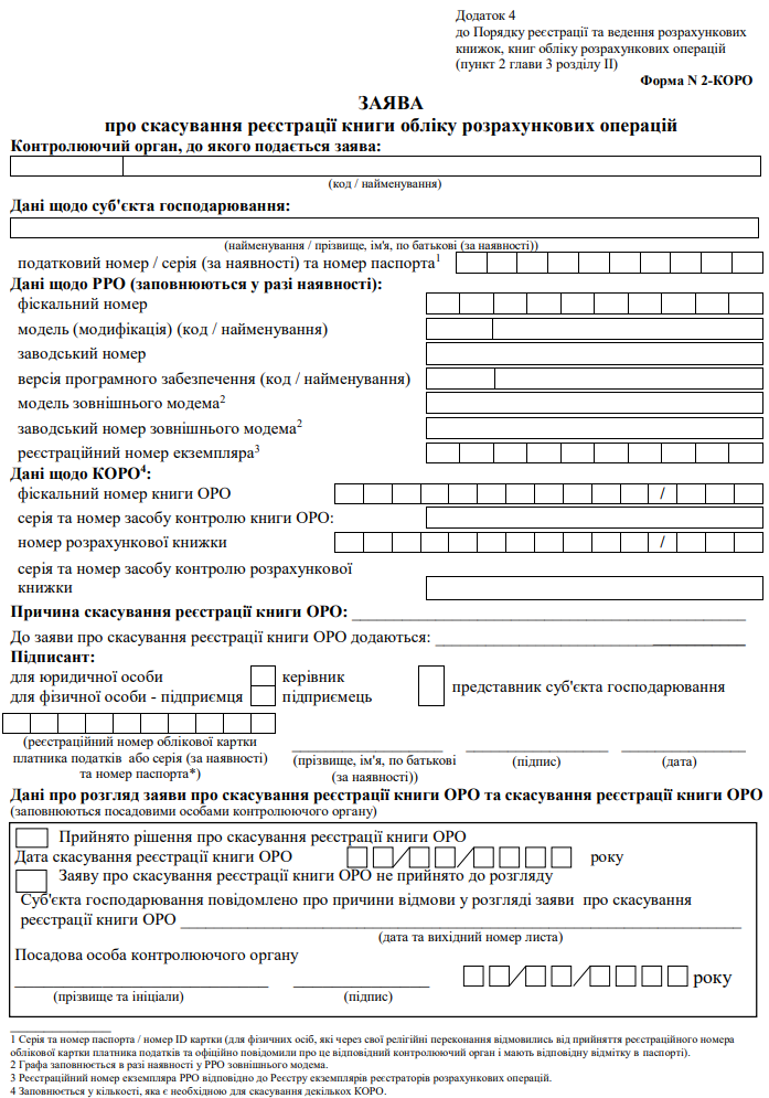 Повна назва бланку: Заява про скасування реєстрації книги обліку розрахункових операцій (ф. №2-КОРО)