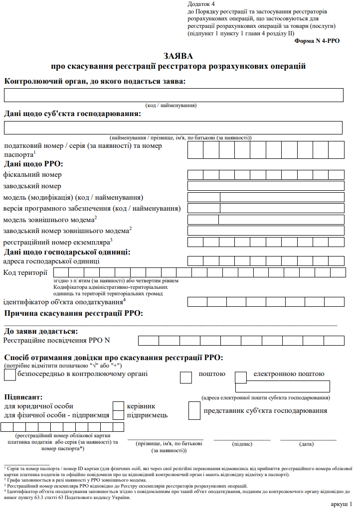 Повна назва бланку: Заява про скасування реєстрації реєстратора розрахункових операцій (форма №4-РРО)
