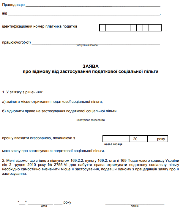 Затверджено бланк "Заява про відмову від застосування податкової соціальної пільги"
