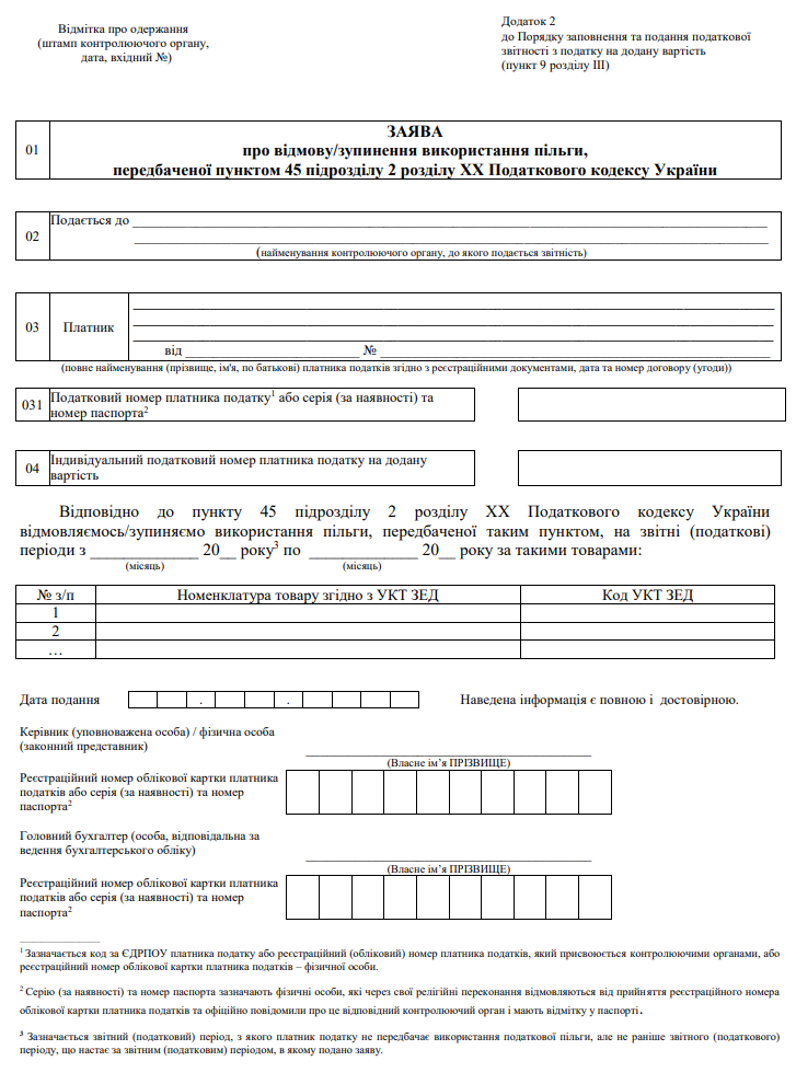 Повна назва бланку: Заява про відмову/зупинення використання пільги, передбаченої пунктом 45 підрозділу 2 розділу ХХ Податкового кодексу України