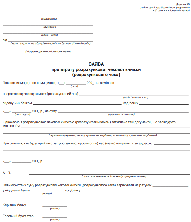 Затверджено бланк "Заява про втрату розрахункової чекової книжки (розрахункового чека)"