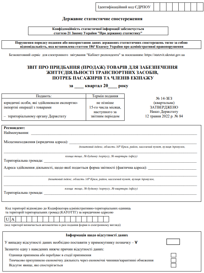 Повна назва бланку: Звіт про придбання (продаж) товарів для забезпечення життєдіяльності транспортних засобів, потреб пасажирів та членів екіпажу (форма №14-ЗЕЗ (квартальна))