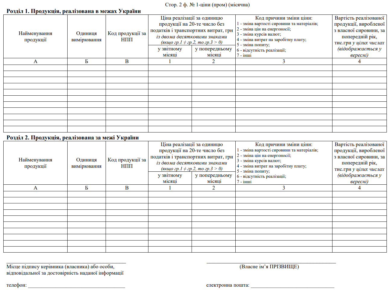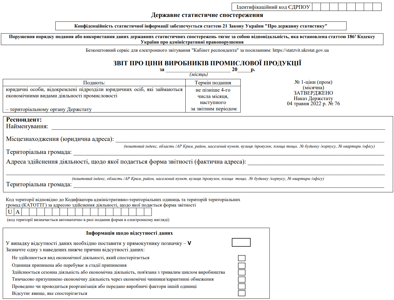 Повна назва бланку: Звіт про ціни виробників промислової продукції (форма №1-ціни (пром)).