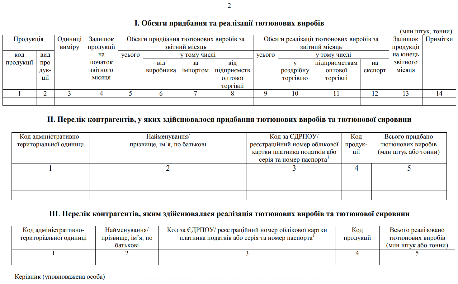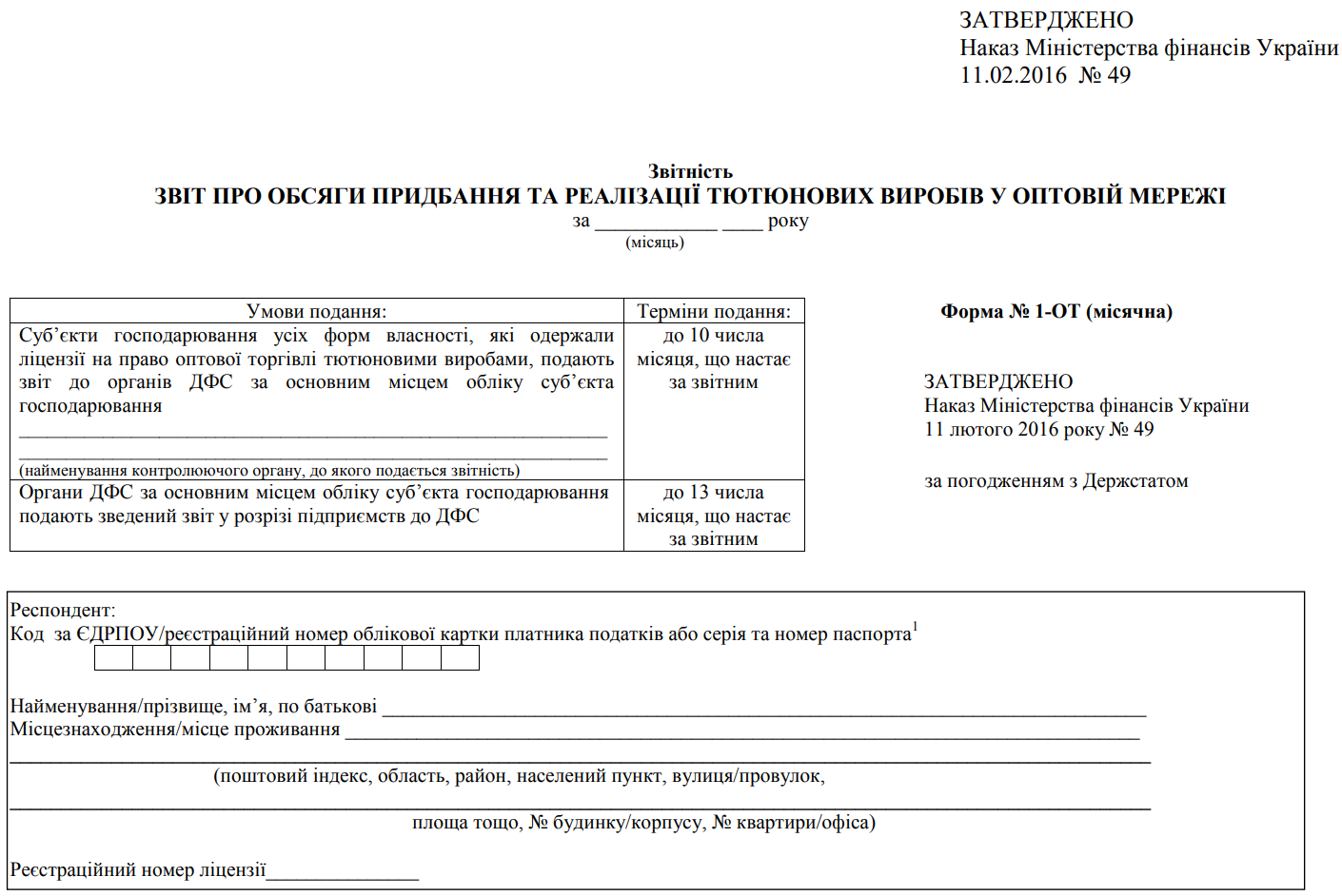 Повна назва бланку: Звіт про обсяги придбання та реалізації тютюнових виробів у оптовій мережі (ф. № 1-ОТ)