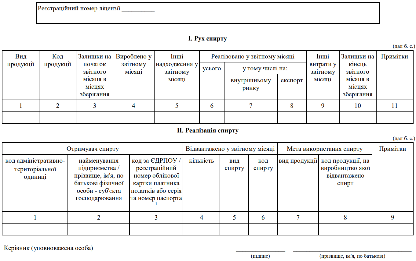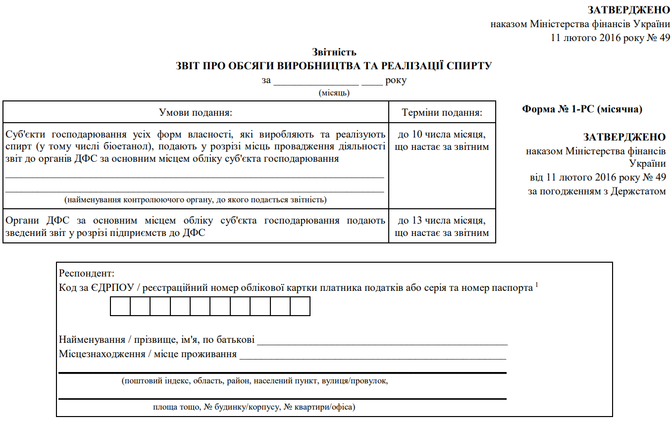 Повна назва бланку: Звіт про обсяги виробництва і реалізації спирту (форма №1-РС)