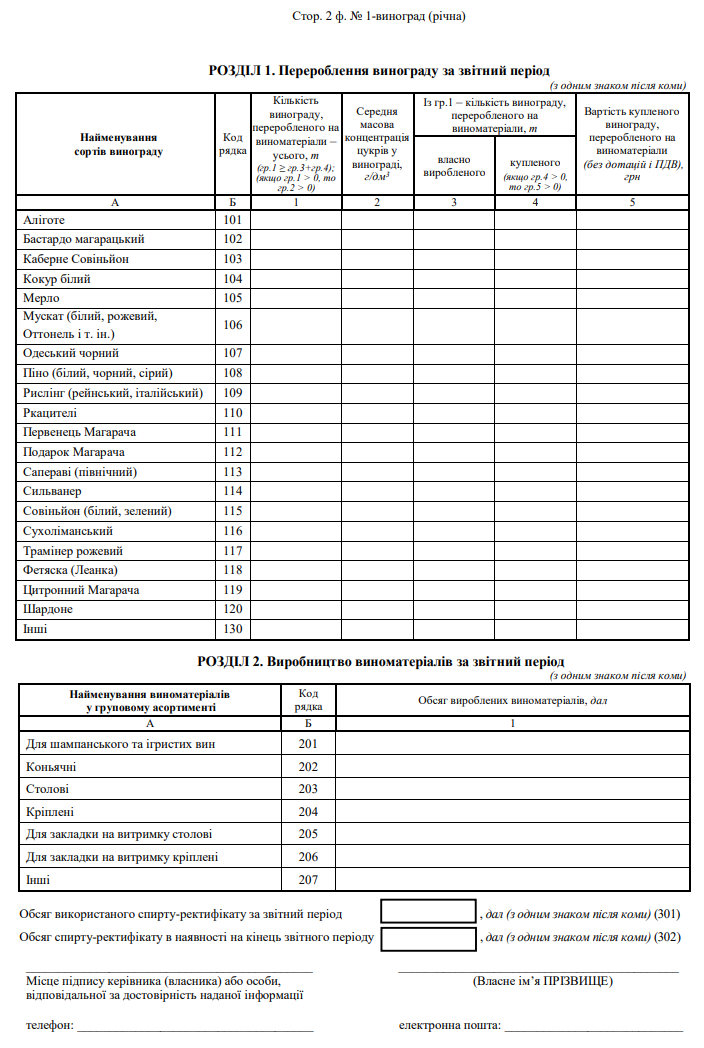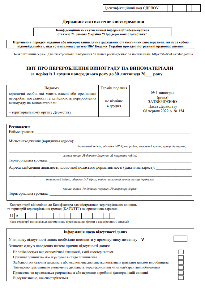 Повна назва бланку: Звіт про перероблення винограду на виноматеріали (форма №1-виноград).