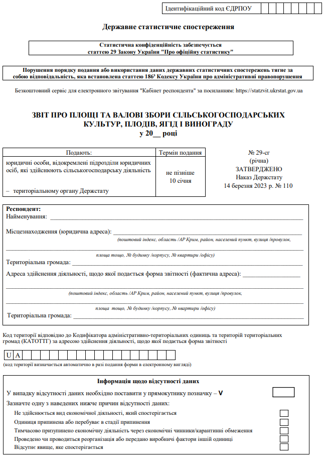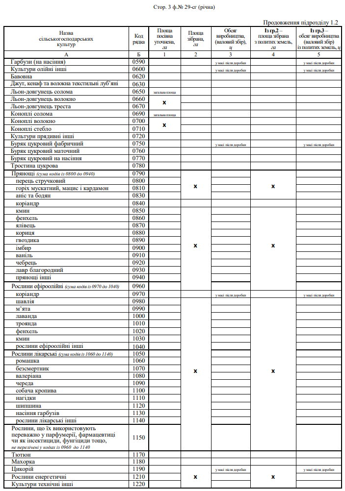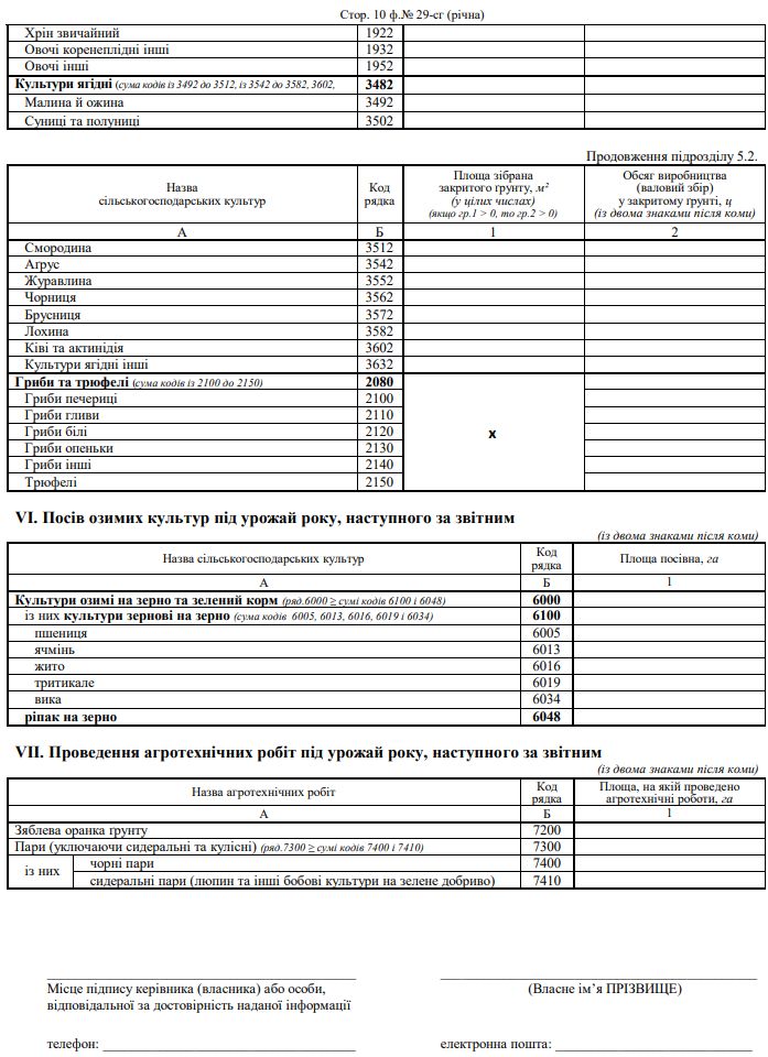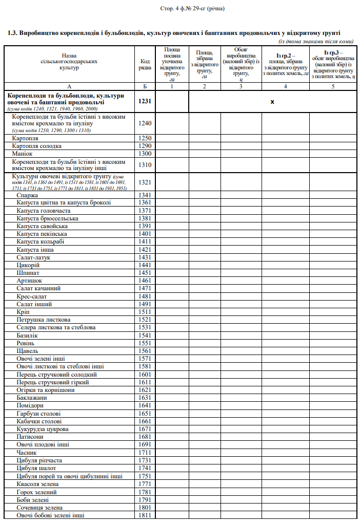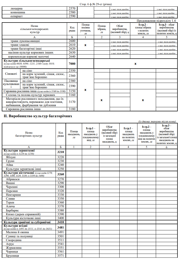 Повна назва бланку: Звіт про площі та валові збори сільськогосподарських культур, плодів, ягід і винограду (форма №29-сг)