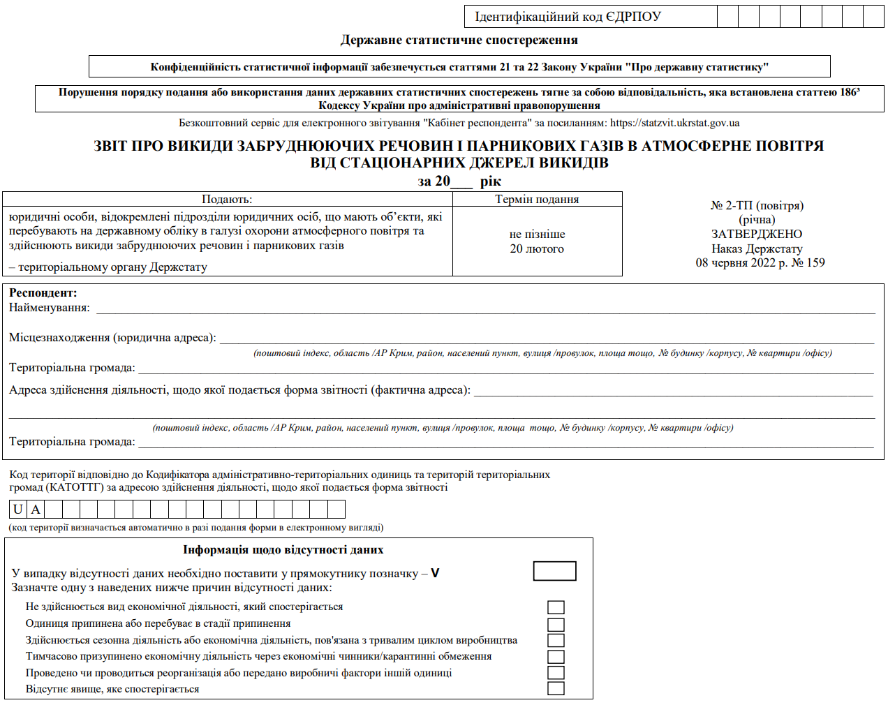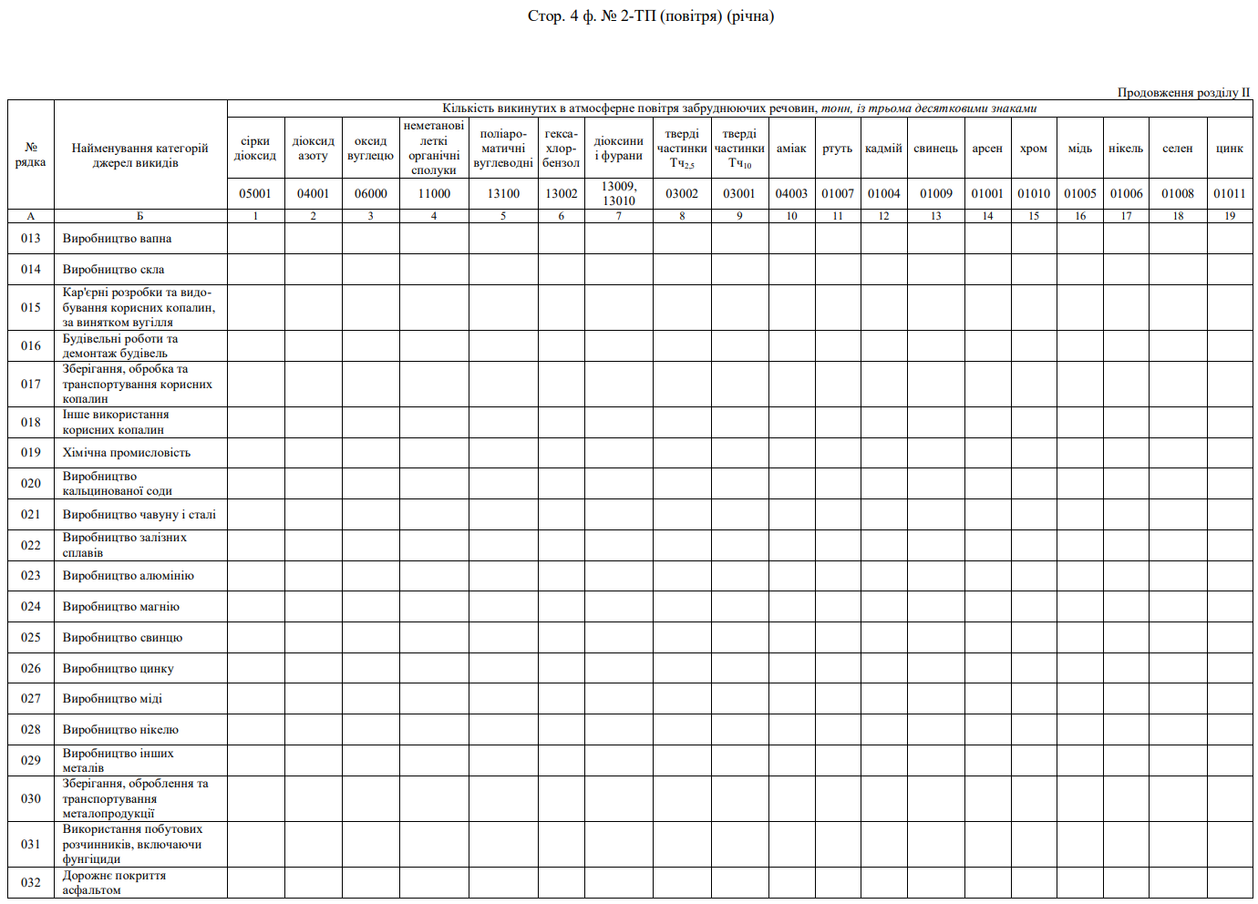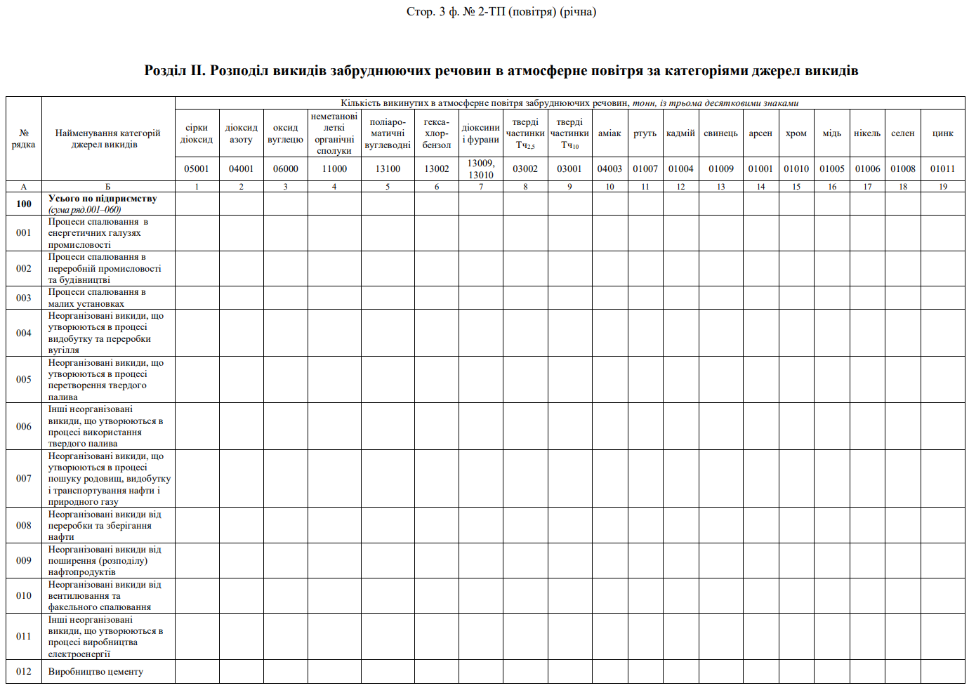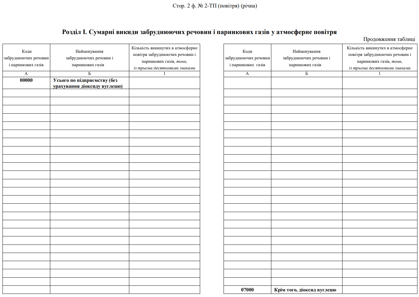 Повна назва бланку: Звіт про викиди забруднюючих речовин і парникових газів у атмосферне повітря від стаціонарних джерел викидів (форма №2-ТП (повітря)).