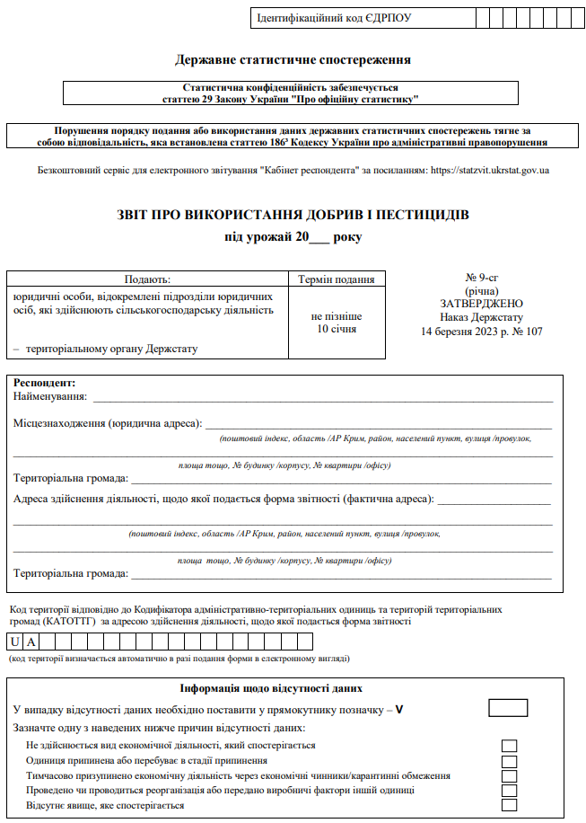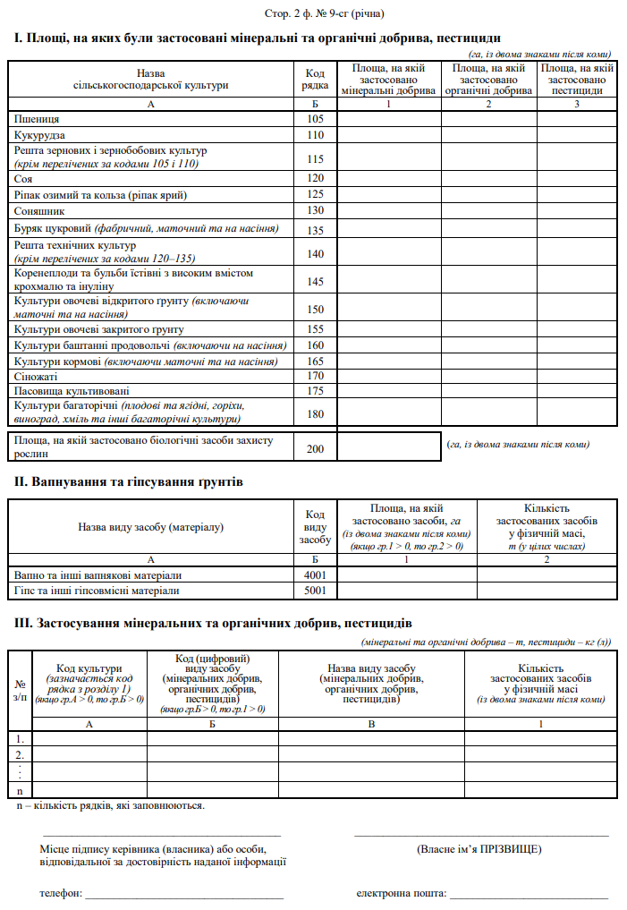 Повна назва бланку: Звіт про використання добрив і пестицидів (форма №9-сг).
