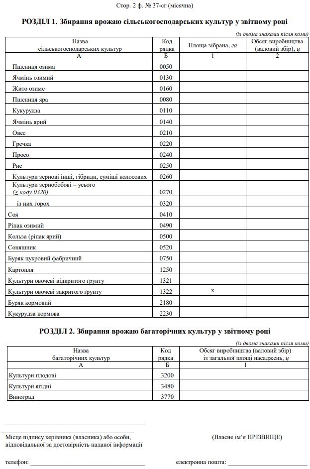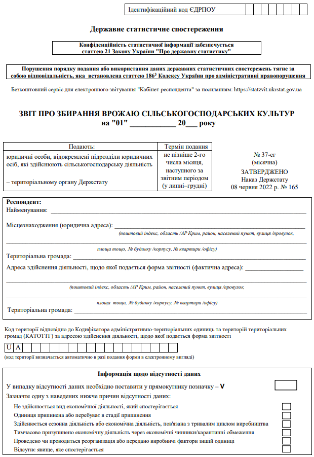 Повна назва бланку: Звіт про збирання врожаю сільськогосподарських культур (форма №37-сг)