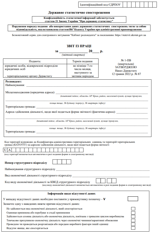 Повна назва бланку: Звіт з праці (форма №1-ПВ) (квартальна)