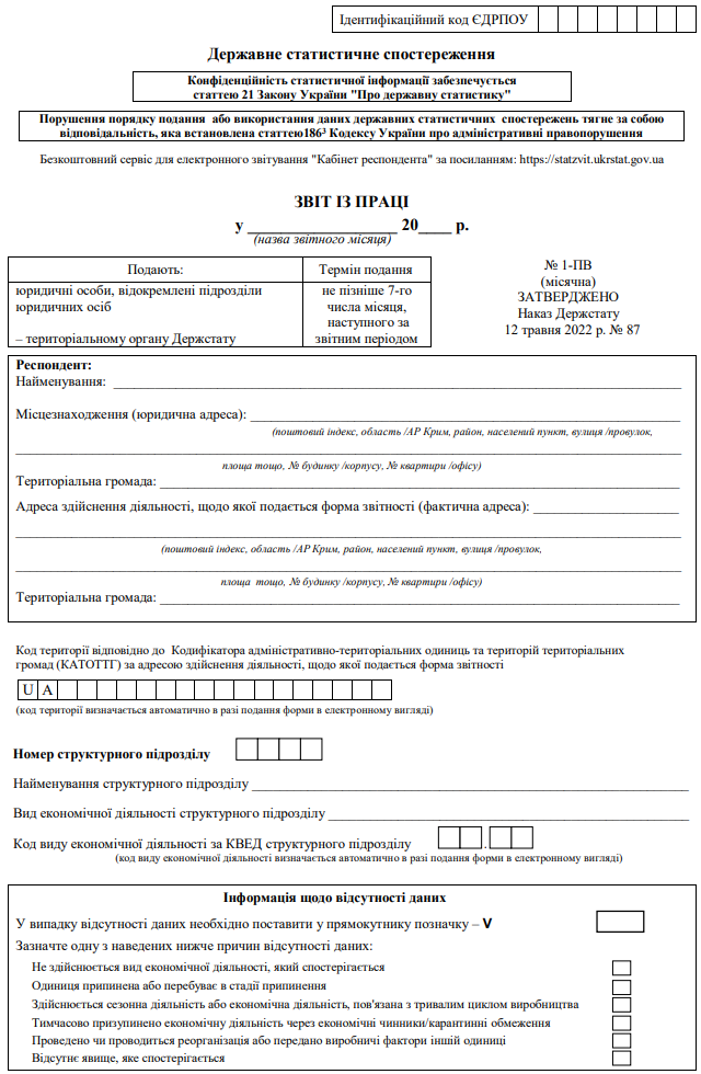 Повна назва бланку: Звіт з праці (форма №1-ПВ) (місячна)
