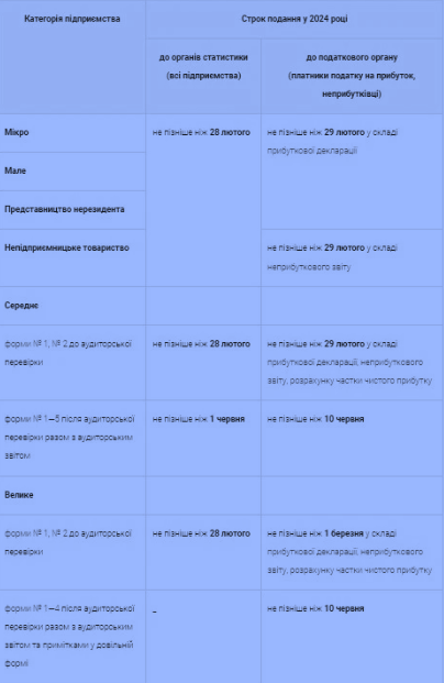 Річна фінансова звітність подається в державні органи - Державну податкову адміністрацію та Державну статистичну комісію - у дещо інші терміни, ніж у минулому. Це пов'язано з тим, що фінансова звітність була і залишається (до можливого запровадження податку на приріст капіталу) невід'ємною частиною декларації з податку на прибуток. Терміни подання фінансової звітності надані у таблиці, як приклад нижче, за 2022 рік.