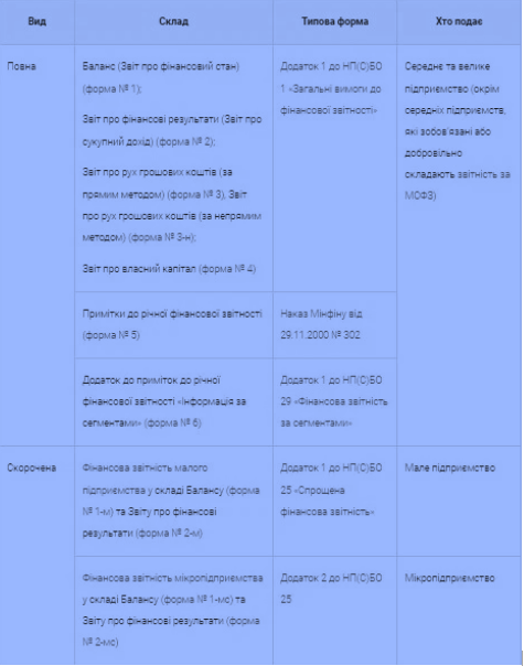 В даний час існує шість форм повного комплекту фінансової звітності та дві форми спрощеної звітності за національними стандартами бухгалтерського обліку. У таблиці наведено прийняті Мінфіном скорочення та альтернативні варіанти для малих та мікропідприємств, індивідуальних підприємців 3-ї групи та інших організацій, що становлять спрощену фінансову звітність.