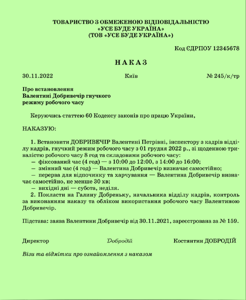 Зразок наказу на встановлення гнучкого режиму