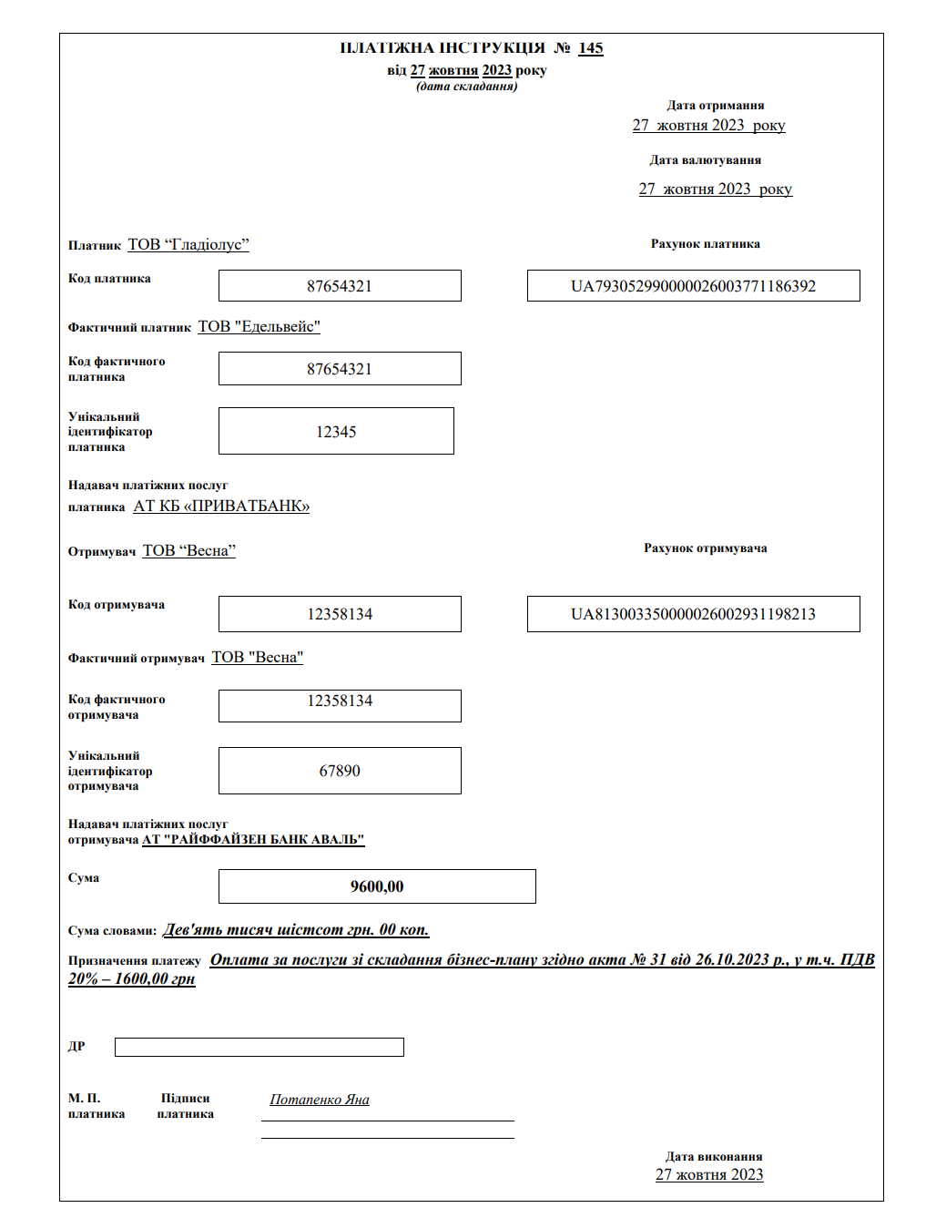 Платіжні інструкції містять два номери рахунків у системі IBAN: рахунок платника (верхній рядок) та рахунок одержувача (нижній рядок). Приклад платіжного доручення, що містить номер банківського рахунку в системі IBAN, наведено нижче.