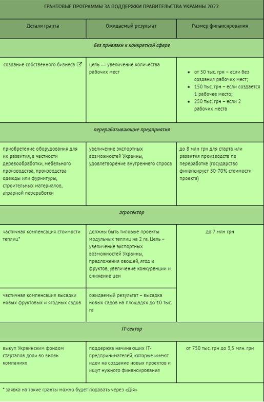 Важливість грантових програм у період війни та у повоєнному відновленні посилюють також і вже наявні безповоротні гранти, які надає український уряд. Напрями цих грантів зібрані в таблиці нижче, і повна інформація про них доступна на сайті "Дія" у розділі "єРобота".