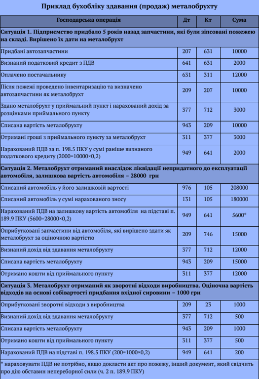 Здавання (продаж) металобрухту в обліку відображається так само, як і звичайна реалізація запасів. Приведений нижче приклад операцій подано в таблиці.