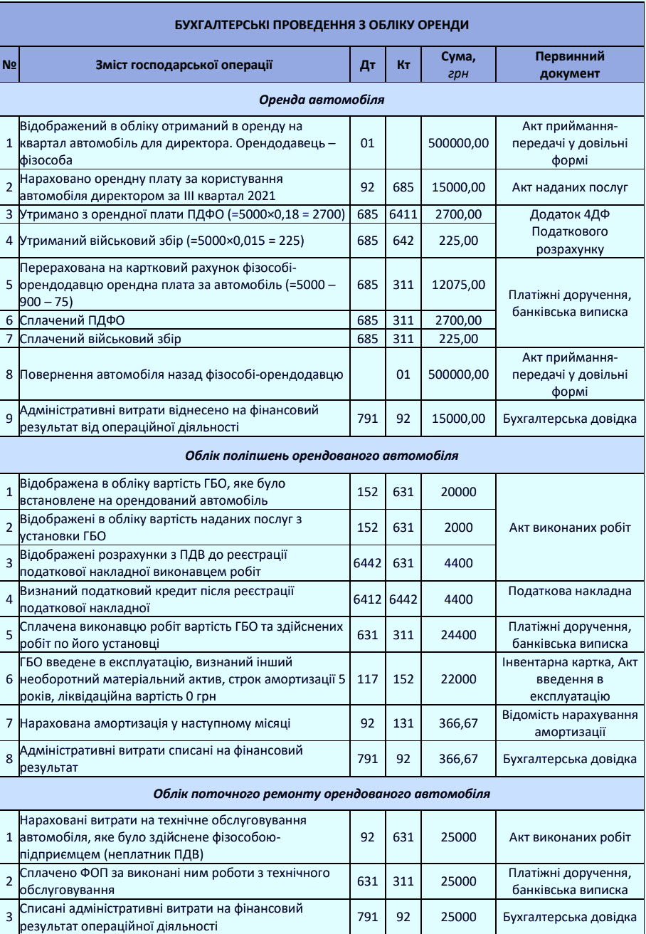 У бухгалтерському обліку оренда та лізинг транспортного засобу у фізичної особи відображається наступним чином: