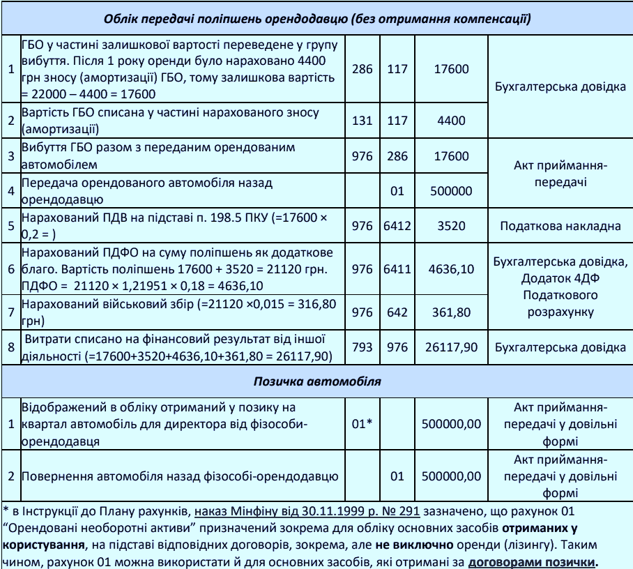 У бухгалтерському обліку орендовані транспортні засоби відображаються на рахунку 01 "Орендовані основні засоби". Поліпшення, здійснені орендарем, відображаються на субрахунку 117 "Інші необоротні матеріальні активи". Для цілей податкового обліку це група 9 "Інші основні засоби" з мінімальним строком корисного використання 12 років (опис ДПАУ 102.05 ЗІР). У цьому випадку об'єкт повертається орендодавцю і п'ятирічний період прискореної амортизації не може бути використаний (п. 431, п. 4 Тимчасових положень Податкового кодексу). Однак ці податкові періоди амортизації застосовуються лише до платників податків з високими доходами. Платники податків з низьким рівнем доходу та платники єдиного податку можуть використовувати будь-який період амортизації, наприклад, той самий п'ятирічний період.