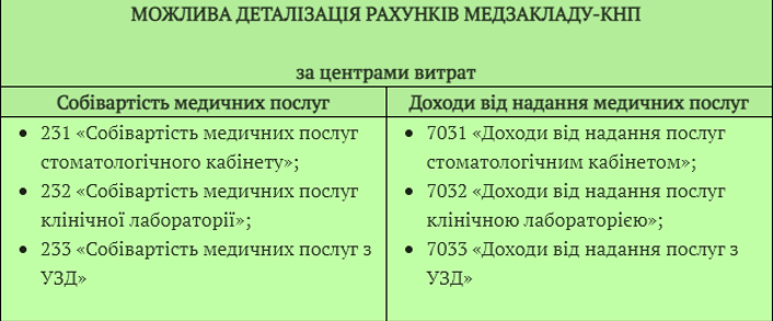 Кожен із рахунків обліку собівартості та доходів може бути розділений на аналітичні рахунки, такі як види медичних послуг. Цей підхід може бути реалізований у вигляді таблиці, де вказані види послуг та відповідні рахунки.