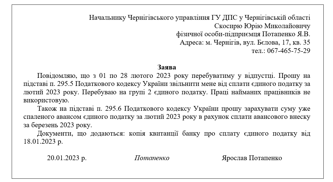 Якщо єдиний податок за відпускний місяць вже був оплачений авансом, рекомендується включити в заяву також прохання про зарахування цієї суми на рахунок сплати єдиного податку у місяці, що настає після місяця відпустки, відповідно до пункту 295.6 Податкового кодексу.