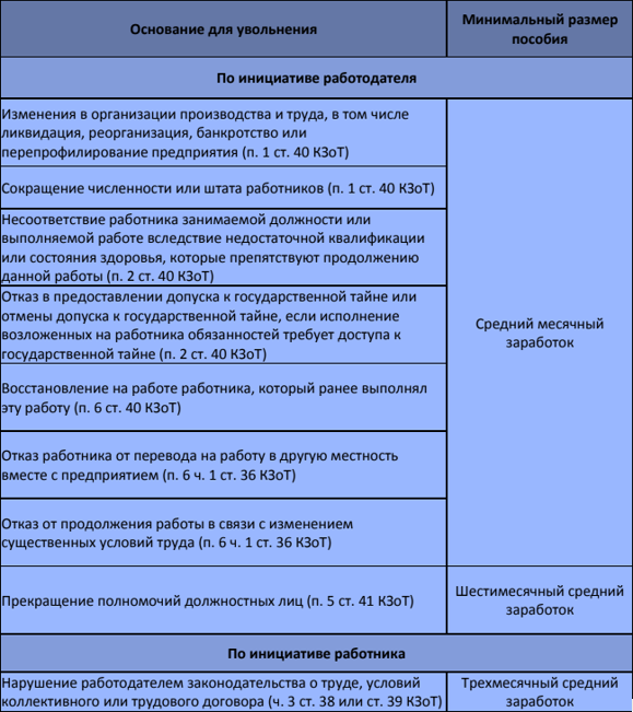 Розмір вихідної допомоги залежить від причин звільнення і становить: