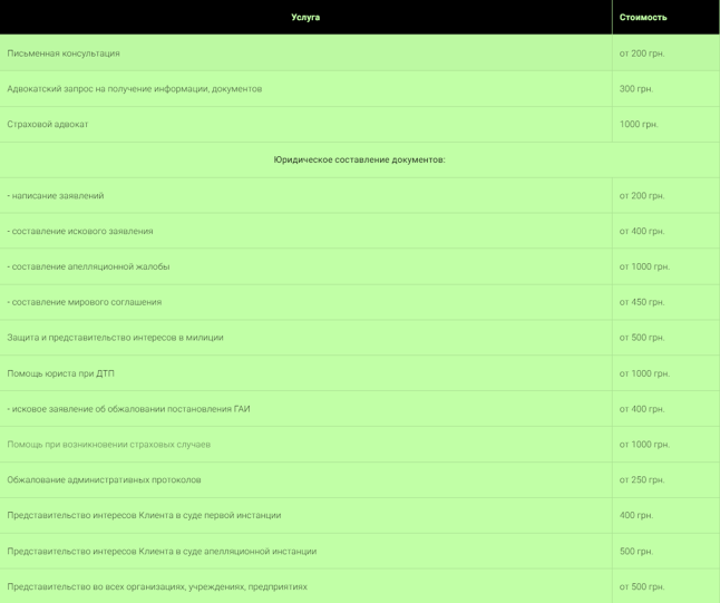 Нижче в таблиці надано орієнтовну вартість послуг адвтоадвоката у разі ДТП. Точну ціну на послуги адвоката з ДТП дізнавайтесь за контактами, зазначеними нижче.
